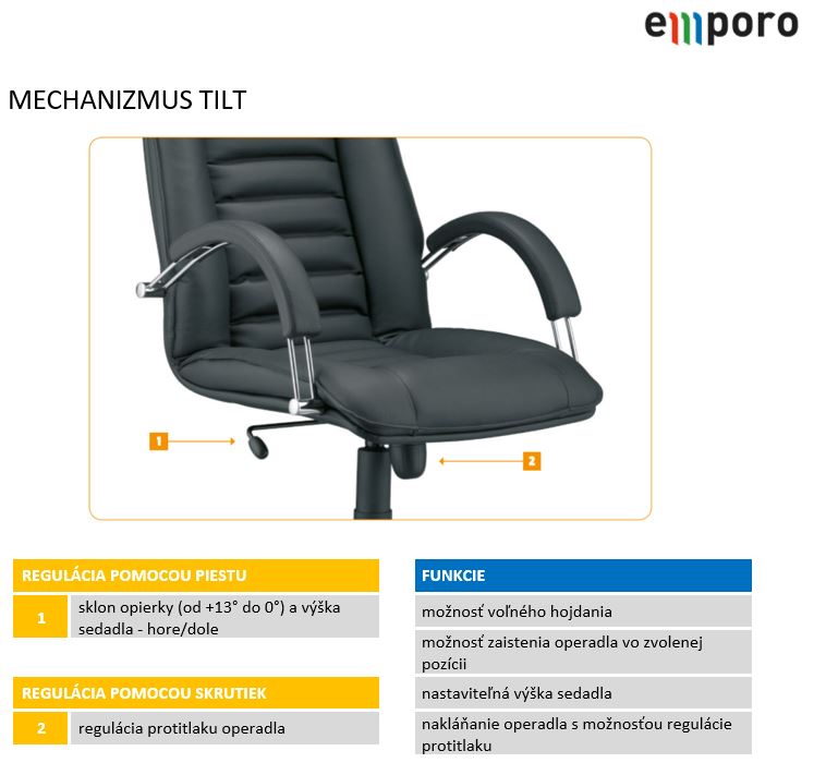 Mechanizmus TILT umožňuje „húpanie“ celého kresla s možnosťou nastavenia prítlačnej sily a aretáciu v jedné pozice. Plynulá regulácia výšky sedáku pomocou plynového, pružného piestu.