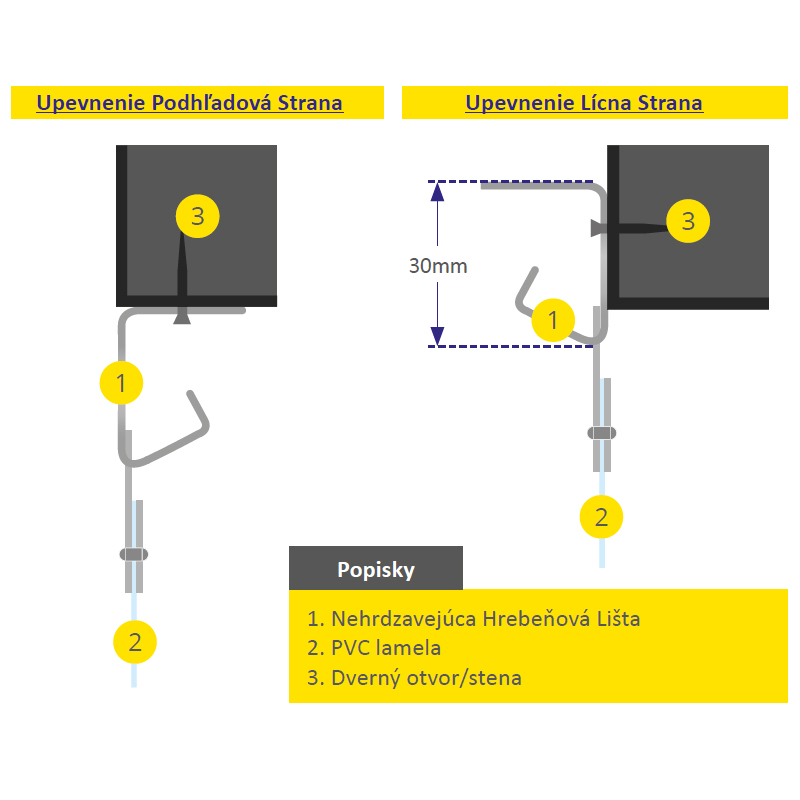 Hrebeňová lišta s hákmi sa uchytí pod hornú hranu priechodu alebo na bočnú stenu popr. k stropu. Lamela s držiakom sa na lištu jednoducho zavesí. Lamely možno zavesiť cez seba a tak dosiahnuť požadované prekrytie. Čím väčšie prekrytie, tým väčšie pôsobenie clony, ale zároveň ťažší prestup.
